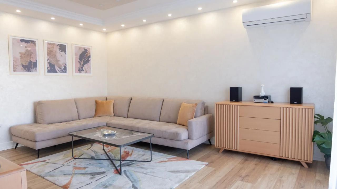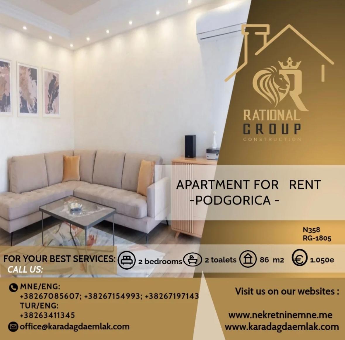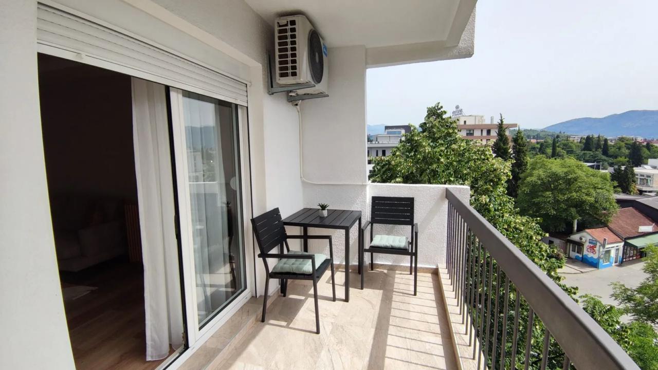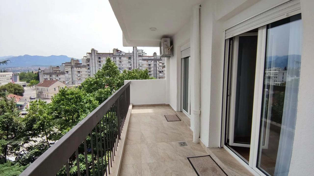 Izdaje se stilski, kompletno komforan dvosoban stan u Podgorici, Trg Bozane Vučinić. Stan je ukupne stambene površine 86 m2. Stan se nalazi na IV spratu u zgradi sa VIII spratova koja posjeduje lift. Orjentisan je istok-sjever, opremljen novim, luksuznim namještajem i tehnikom renomiranih brendova. Struktura: ulazni hodnik, s desne strane su prostrana dnevna soba, trpezarija, kuhinja, balkon sa garniturom za odmor, a sa lijeve strane ulaznog hodnika su vešeraj/ostava, gostinjski toalet, mali hodnik/predsoblje, glavno kupatilo, master spavaća soba, druga spavaća soba, veliki balkon na koji izlaze obje sobe. Uz stan dolazi i pripadajuća pomoćna ostava smještena u hodniku zgrade. Stan posjeduje podno grijanje, kompletno je klimatizovan. Kuhinja je opremljena svim potrebnim malim aparatima i posuđem. Veoma dobro je osvijetljen prirodnom svjetlošću. Postoji mogućnost iznajmljivanja garažnog parking mjesta u susjednoj zgradi.