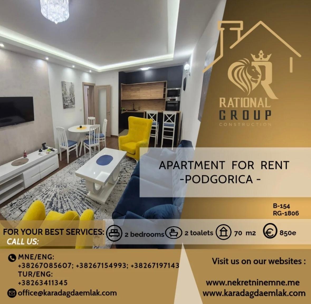 Izdaje se dvosoban stan 70m2. Stan posjeduje 2 kupatıla, nalazi se na 6.spratu stambene zgrade, Master kvart, Podgorica.  Zgrada posjeduje 2 lifta.