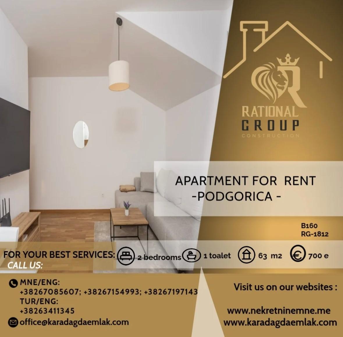 Opis Izdaje se dvosoban stan 63m2 koji se nalazi na 4.spratu pored vrtica Jelena Cetkovic , Podgorica( Konik- Stari Aerodrom) Sıfra: B160 RG-1812 Cıjena zakupa: 700€